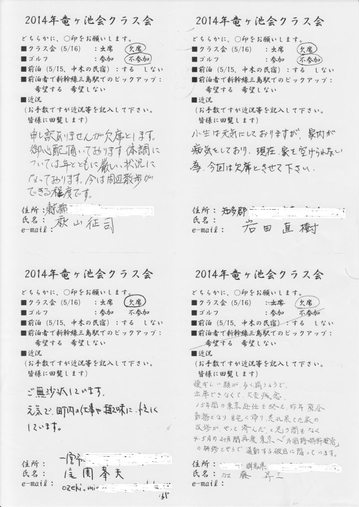 ・クラス会(5/16):出席、欠席 ←出席します。